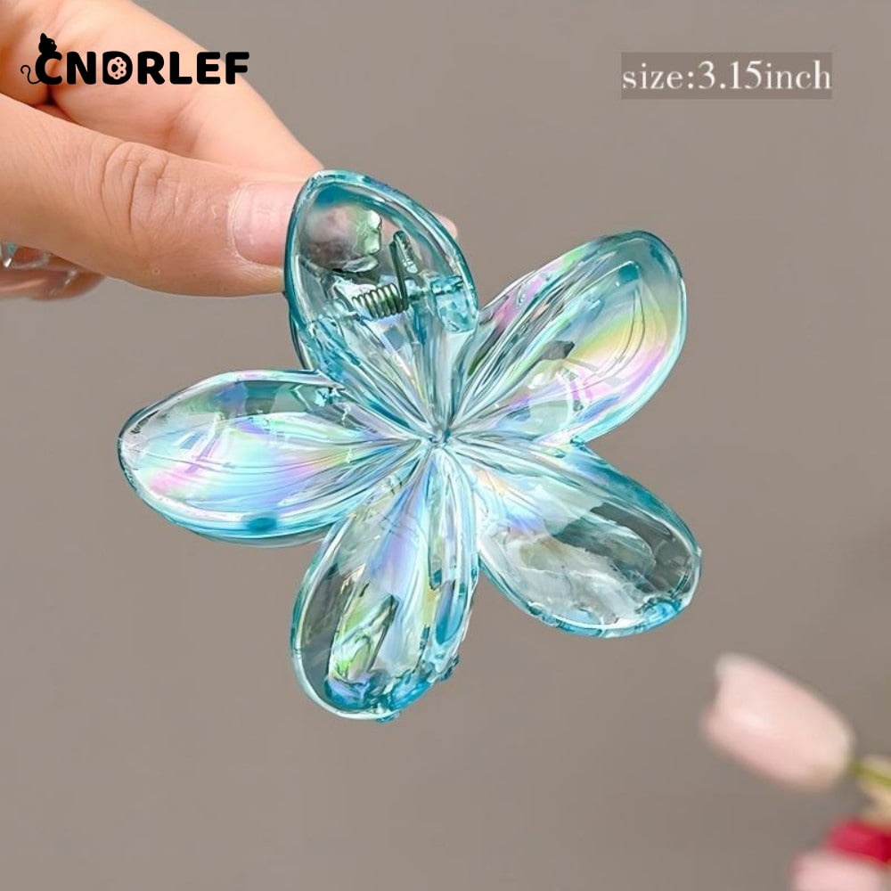 - Sparkling 4-Piece Set (3.15" Large): CNDRLEF provides 4 generously sized (3.15 inch diameter) flower-shaped claw clips in stunning Blue, Clear, Gold-tone, and Pink. Each clip features an elegant 5-petal design with a captivating rainbow iridescent finish that shines in the light.