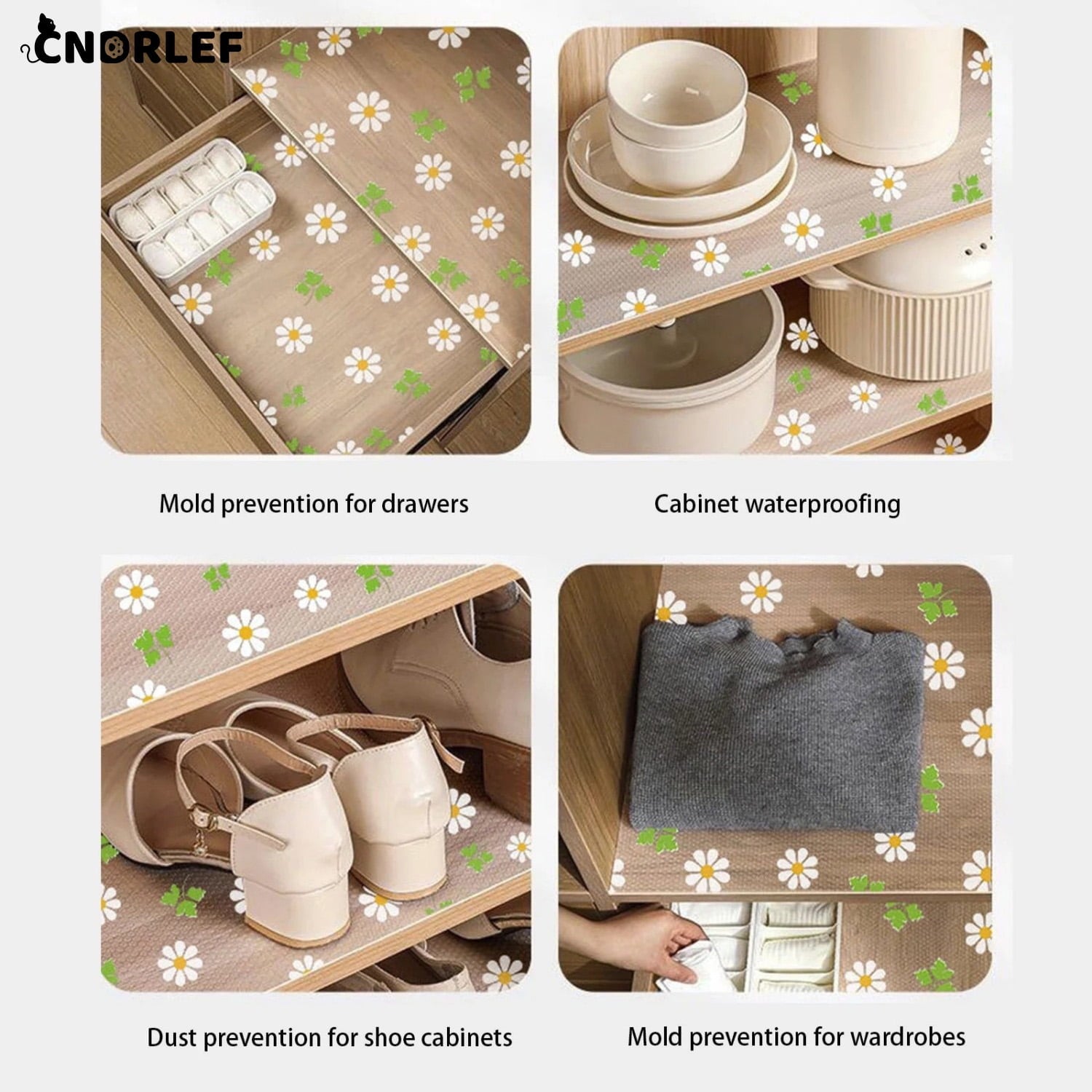 The CNORLEF shelf liner features a charming daisy and clover pattern, made from high-quality waterproof PVC material. It provides optimal protection for your cabinets, drawers, and shelves against moisture, mold, and dust. With its non-slip convex-concave surface, items stay securely in place. Easy to install without adhesive—simply cut to size and lay it down. This reusable liner is effortless to clean with a damp cloth, making it ideal for kitchens, bathrooms, closets, and more. Keep your home organized and stylish with this durable, practical solution.